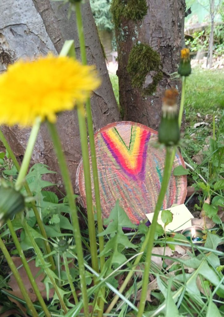 Meine ganz persönliche Abschlussarbeit war eine bemalte Baumscheibe mit dem Titel „Aufbruch“ denn ich fühle, wie etwas in mir aufgebrochen ist und dass es außerdem Zeit ist, aufzubrechen und mich auf den Weg zu machen. 👣 Mein Weg liegt klar vor mir.